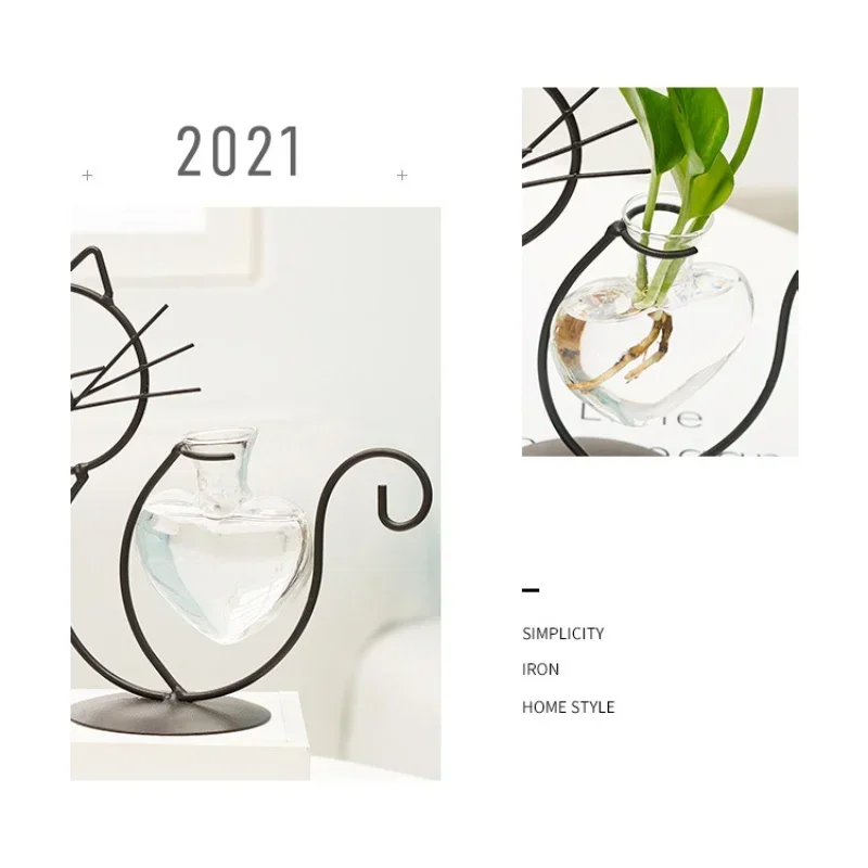 💘 Vaso Coração de Vidro e Gato Artesanal: Suporte de Metal Soldado à Mão – Romântico e Hidropônico!